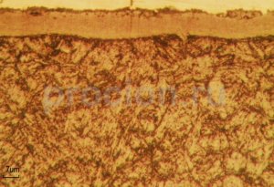 Параметры слоя: глубина (h) 0,40 - 0,42 мм и твердость 680 - 700 HV10 (кгс/мм2), толщина нитридной зоны (h н.з.) 10 - 13 мкм.